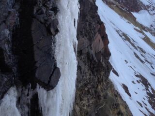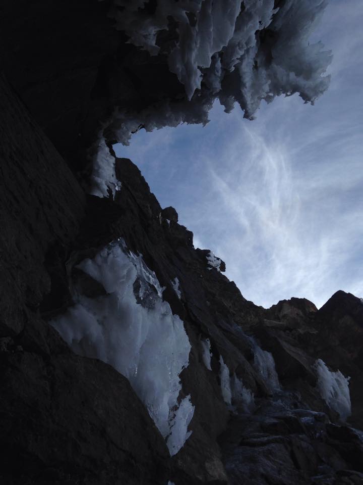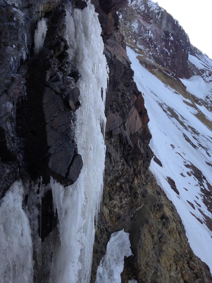 Aún así posé mis crampones suavemente sobre el hielo y empecé a ascender. Los swings eran delicados, más como colocación de drytool en hielo freestanding granizado. Después de unos metros y sentir como se movía todo, decidí que mi vida valía más que la probabilidad. Ese candelabro tal vez podía aguantarme o tal vez no. Era un volado que no quería echar. Regresé a la reunión con un nudo en la garganta. Probé el lateral de la cascada usando la roca como mixto. Empecé a ganar metros en posiciones completamente precarias mientras me percataba de lo separado que estaba el hielo de la roca. El candelabro seguía vibrando. Intenté meter un stopper para proteger, pero cuando lo jalé para probar su resistencia, el interior costroso de la grieta se quebró, sacándolo y desbalanceándome. Temblando de miedo desescalé a la reunión mientras las palabras de animo y prudencia de Ramón y Andrés resonaban en mi. Pegué un grito de desesperación. Era estúpido creer que podría subir por ahí. Descendimos a rappel abandonando una estaca y al tocar el suelo una roca golpeo a Andrés en el casco. Por suerte solo lo atarantó un poco. Estaba claro, nos íbamos de ahí.