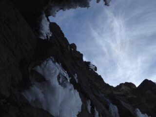 Ascendía por la rampa lleno de emoción y ansiedad, esta era la oportunidad. Sabía que era mía. Observaba todas sus fascetas mientras nos acercábamos. La entrada vertical de hielo y mazapán, la rampa de nieve y el imponente candelabro que colgaba de la roca por lo que parecían ser 20 metros. Después de eso, una enorme repisa y dos cascadas más antes de salir a la cumbre. Ilusionado, toqué la entrada de la cascada, la sección de roca mazapán y hielo granizo, y comencé a escalarla en libre sin mayor complicación. Superé los 12 metros de hielo y me moví a gran velocidad sobre una rampa de nieve dura de 70º de inclinación o más. Hasta aquí habían transcurrido al menos 35 metros verticales. Estaba ansioso por golpear el candelabro, pero primero coloqué dos estacas y lancé la cuerda a Ramón mientras Andrés liberaba también en libre la primer sección.