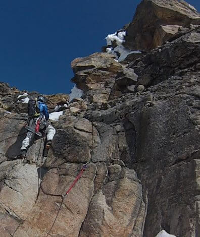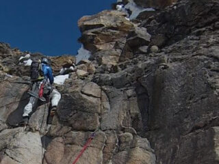 Entré a la sección de roca mazapán, esta vez solo con uno o dos centímetros de hielo sobre la roca. Proteger era imposible y el estilo se volvió Dry/Mazapan Climbing. Esta vez no fue una escalada fácil. Delicadeza, buena técnica y concentración me fueron requeridas mientras subía. José buscaba otro paso por la roca seca y al final acabó a varios metros de distancia teniendo que hacer una travesía de terror en la cual decidimos quitarnos los crampones y usar la cuerda con métodos tradicionales a cuerpo.