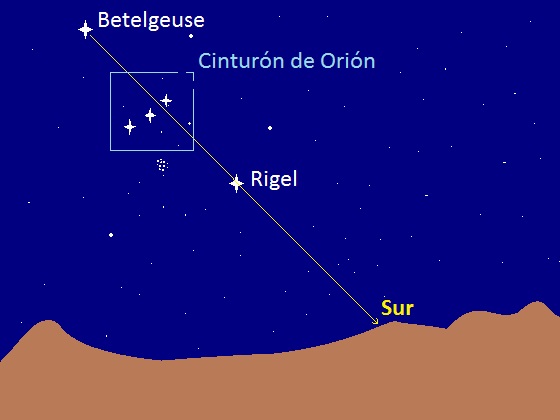 - Cuando las tengamos localizadas realizaremos una línea recta e imaginaria de Betelgeuse a Rigel y la prolongaremos (también en línea recta) hasta el horizonte.