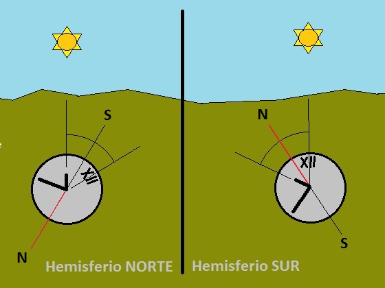 Conclusión para el Hemisferio Sur:El Norte vendrá indicado por la bisectriz del ángulo formado por la aguja corta y la línea imaginaria de las doce en punto.