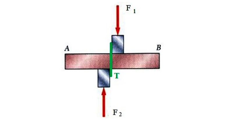 Tensión de corte es cuando dos partes del material tienden a deslizarse una contra la otra, aplicando una fuerza cortante en un solo punto de una barra de acero fija.