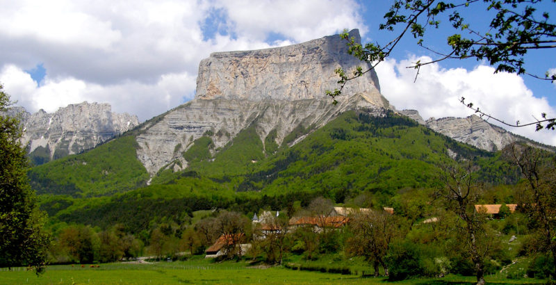 Mucho más que la altitud -con apenas 2,087m-, es la extrañeza de las formas lo que asegura la celebridad de esta montaña. Se trata del Mont Aiguille, que en aquel momento se llamaba Monte Inaccesible. Es un bloque con paredes verticales de casi 300 metros de altura con una peculiar cima, ni redonda ni puntiaguda, sino con forma de una terraza casi horizontal, como una isla de vegetación rodeada por una feroz muralla. Para aquellos tiempos y como su nombre lo decía, innaccesible.