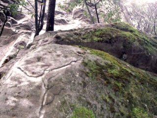 [dropcap size=big]E[/dropcap]ra una mañana fría de invierno cuando nos dimos a la tarea de limpiar un nuevo bloque que ya teníamos ubicado. Se encuentra en una cañada en el bosque mágico de Las Manzanas, a un costado del sector Domdo. Con cepillo en mano empezamos a remover musgo, tierra, ramas y con cada cepillada fue cobrando vida una línea nueva en este gigante de piedra. La mañana siguió avanzando y el musgo parecía interminable pero cada cepillada era recompensada con el hallazgo de un nuevo agarre: una regleta por aquí, un sloper por acá, un lateral por allá y poco a poco como surgido de la nada estábamos frente a este nuevo boulder perfecto que esperó por siglos a ser ascendido por un primer elegido.