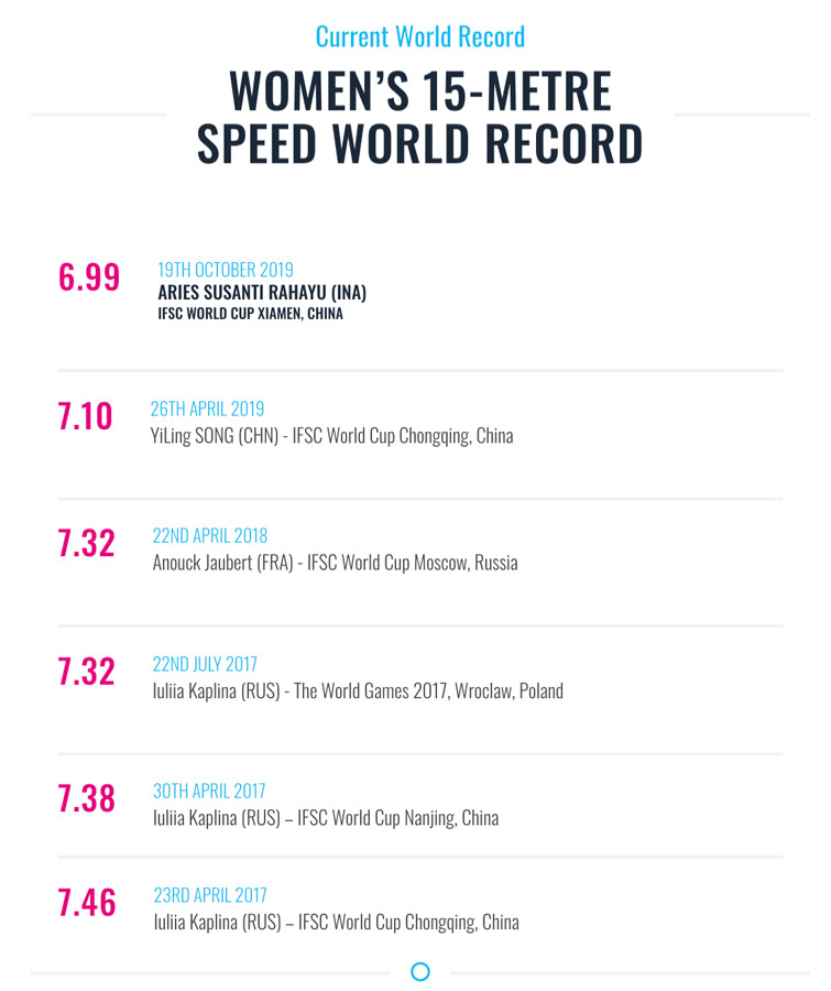 La oriunda de Indonesia ha estado en el radar de la comunidad escaladora por su impresionante forma y competitividad. Fue el pasado 19 de octubre, en la Copa del Mundo de Xiamen, China, cuando Aries rompió la barrera de los 7 segundos y escaló la pared de 15 metros en 6.99 segundos.