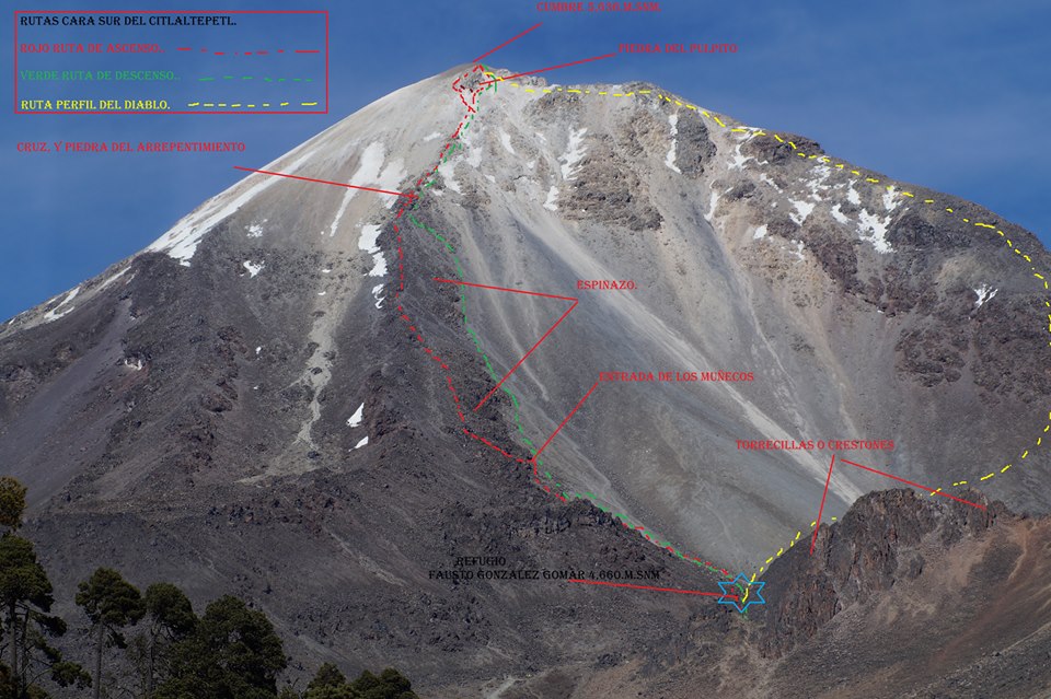 Es frecuente encontrar gente que usa el recorrido que va más a la izquierda, si miramos desde la cima del Pico de Orizaba al refugio Fausto González Gomar 4,660msnm, como una ruta de descenso (color azul). Sin embargo, es la zona más peligrosa de la cara sur del Pico de Orizaba -colador antes mencionado-.