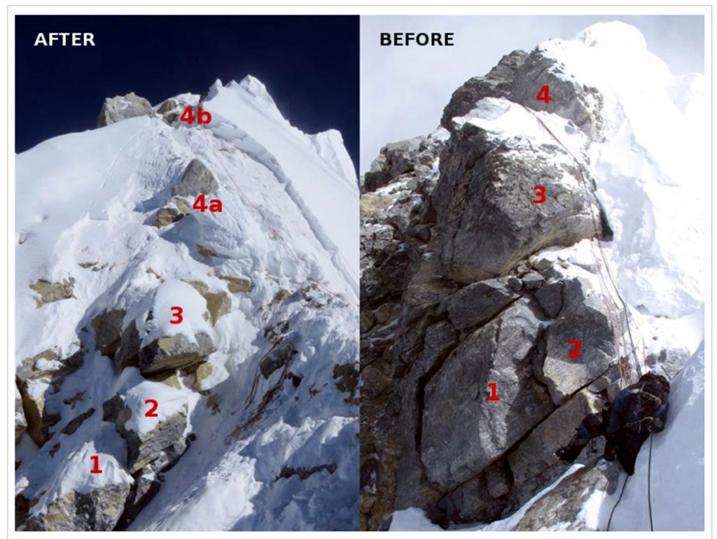 El propio David Liaño, alpinista mexicano emanado de las filas del Club Alpino Mexicano, publicaba en 2016 una foto comparativa entre lo que solía ser el Escalón Hillary, y el movimiento que había tenido las rocas para el momento en que atravesó el Escalón en su paso para encumbrar el Everest el 12 de mayo de ese año: