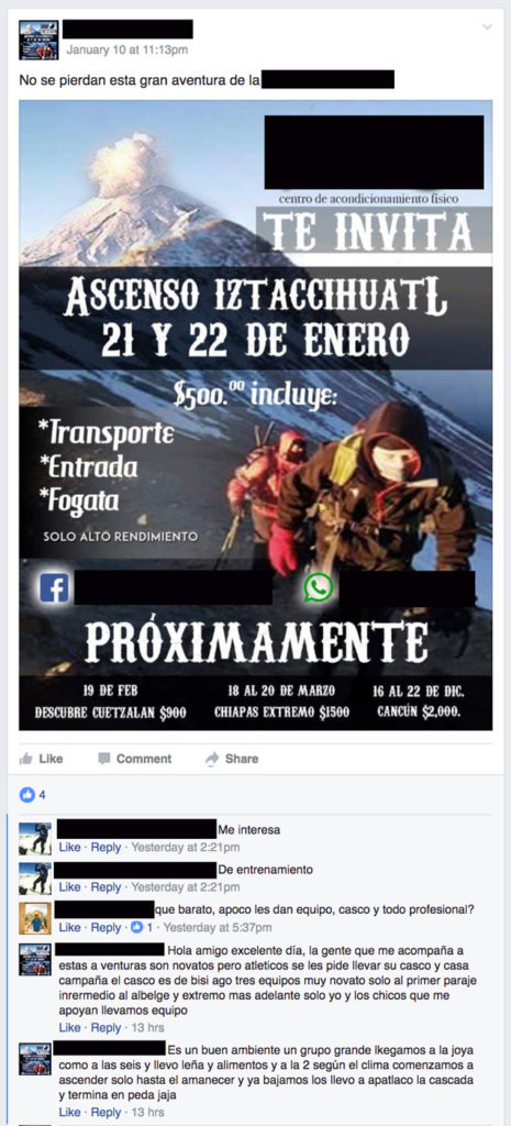 De acuerdo a la publicación, se invita a ascender el Iztaccíhuatl en dos días, incluyendo transporte, entrada y fogata, todo por 500 pesos. El precio por sí mismo es suficiente para reconocer al charlatán si consideramos los costos típicos de un ascenso en el que se debe incurrir en alimentos, renta o costo prorrateado del equipo, botiquín, equipo de comunicación, etc. Por tal, se concluye que no llevan lo necesario y esperan -en el mejor de los casos-, que lo lleve el cliente.