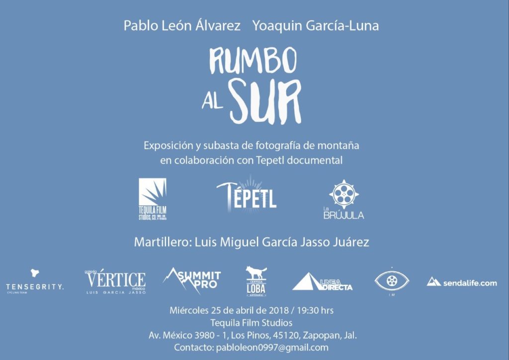 Con el objetivo de recaudar fondos para su proyecto Rumbo al Sur, Pablo León Álvarez y Yoaquín García-Luna, en colaboración con Tepetl documental, organizarán una exposición y subasta de fotografía de montaña este próximo miércoles 25 de abril en la ciudad de Zapopan, Jalisco.