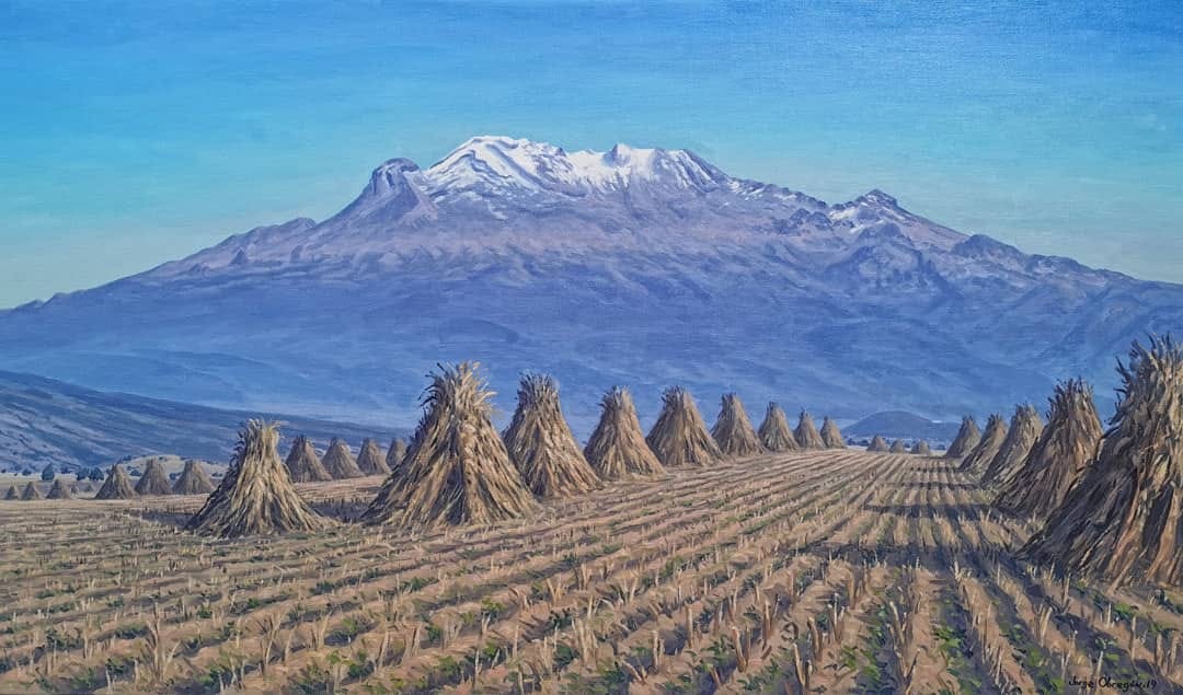 Jorge Obregón (J): Desde pequeño tuve una inquietud por caminar en las montañas. Estudié artes visuales en la Escuela Nacional de Artes Plásticas de la UNAM, a las afueras de la Ciudad de México, donde en el horizonte apreciaba los volcanes mexicanos. Allí, uno de mis principales maestros fue Luis Nishizawa, quien a su vez quedó con el legado de Dr. Atl. Él me invita a salir al campo para pintar y es de donde obtengo mi influencia, pues me muestra un nuevo camino donde la pintura ya no nace a partir de fotos sino de ir directamente a la naturaleza con el caballete, trabajar en vivo y al aire libre. De ahí surge mi trabajo de tesis “Los Volcanes de México: una experiencia al aire libre”.