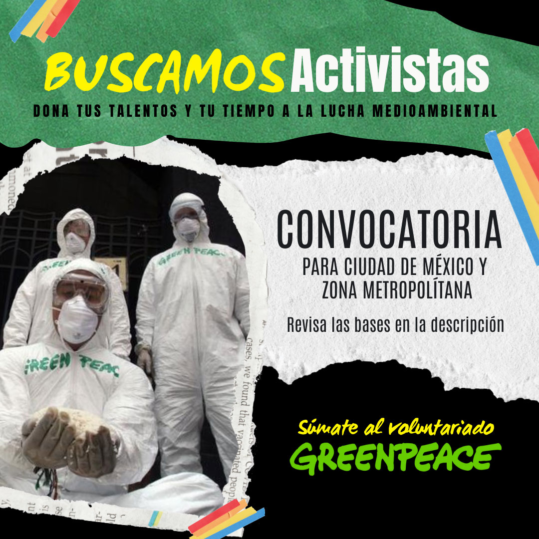 Si vives en la zona metropolitana de Ciudad de México y tienes habilidades y pasiones que deseas compartir, esta es tu oportunidad. Greenpeace busca diversificar su equipo y emplear tácticas creativas y no violentas para abordar injusticias ambientales.
