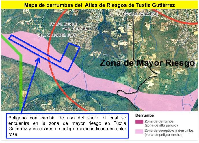Asimismo, El Atlas de riesgo de Protección Civil de Chiapas indica esta zona como la de mayor riesgo por derrumbes en la ciudad, por lo que no es apto para uso habitacional.
