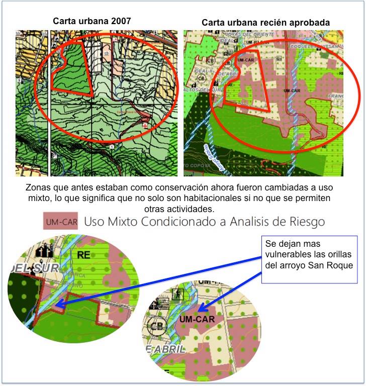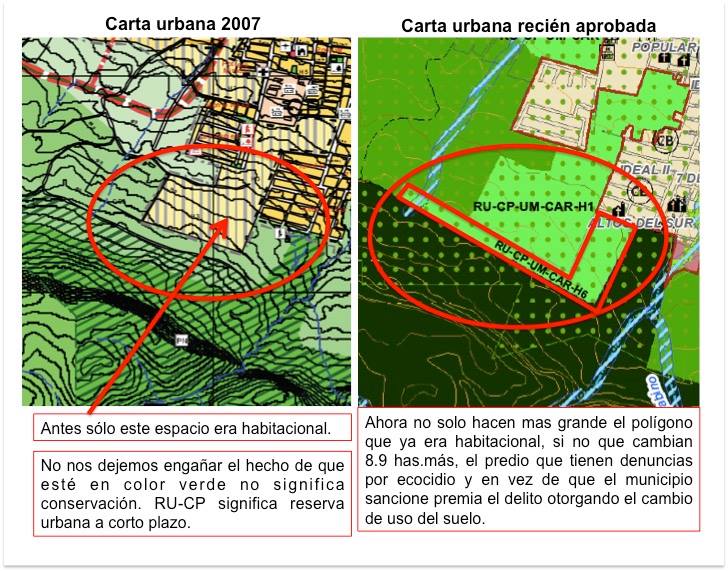 “Mencionan que realizar un fraccionamiento es para la conservación, pero esa zona es el área de amortiguamiento de la Reserva Estatal por lo que, para ser congruente, debería de tener al menos una lotificación de mínimo cada 3 hectáreas, tal como lo marcaba la Carta Urbana 2007, y no cada 500 metros como ahora lo plasman, lo cual es aún mayor densidad de casas que los predios categorizados en H1, significando 178 casas, ¿acaso todas esas casas son necesarias para hacer una barrera contra las invasiones?” – Boletín de Prensa de La Unión para la Conservación de la Meseta de Copoya, Grupo Escala y Unión de pequeños propietarios.
