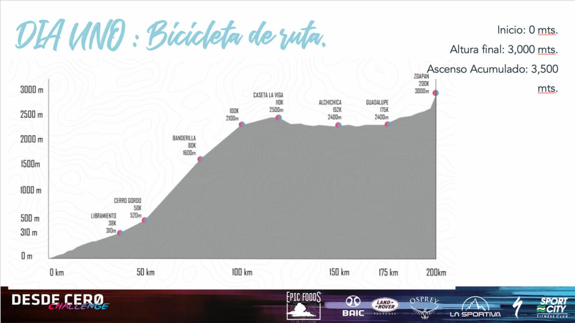 Se trata de un desafío único en su categoría. Desde Cero Challenge contempla tres disciplinas, pero además los cuarenta participantes se enfrentarán a otros dos componentes. Sumados a los 200km de bici, 17km de trail running y los 5km de hiking, se tendrá que superar un importante desnivel positivo, así como los efectos de la altitud, pasando de los 0msnm, hasta los 5,100msnm en el Pico de Orizaba, (todo en dos días).