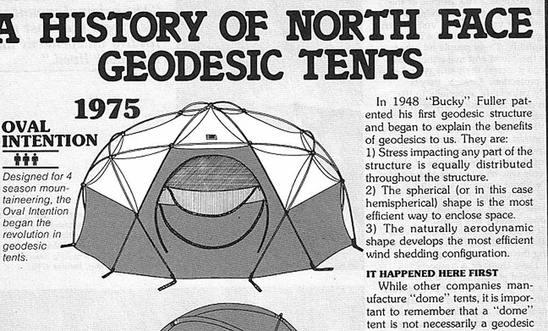Pero en la actualidad las tiendas poseen un punto en el que todos concuerdan: el modelo geodésico fue la revolución de la revolución. Creada en 1975-1976 por Robert «Bob» Gillis, Bob Howe, Mark Erickson y Bruce Hamilton empleados de la marca norteamericana The North Face.