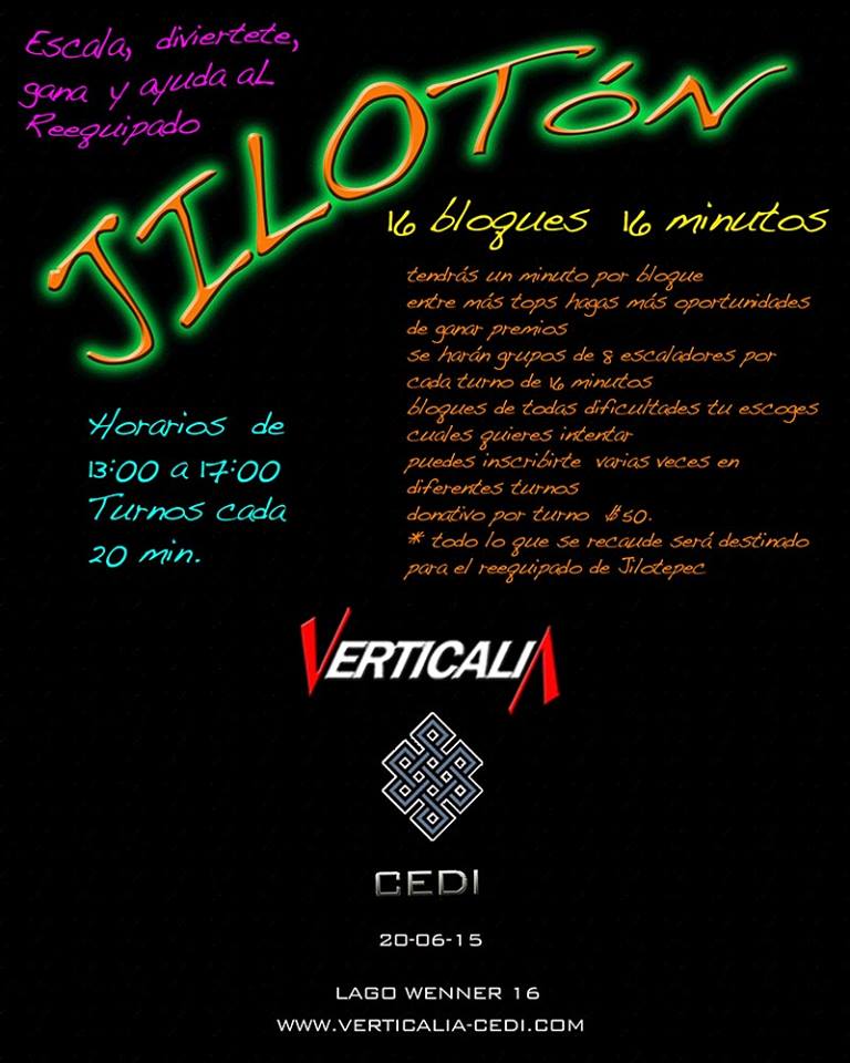 13:00 – 17:00 hrs: Jiloton. Maratón de escalada con 16 bloques y solo un minuto disponible por bloque. Los fondos recabados por la inscripción serán utilizados para apoyar las labores de re-equipado en Jilotepec.