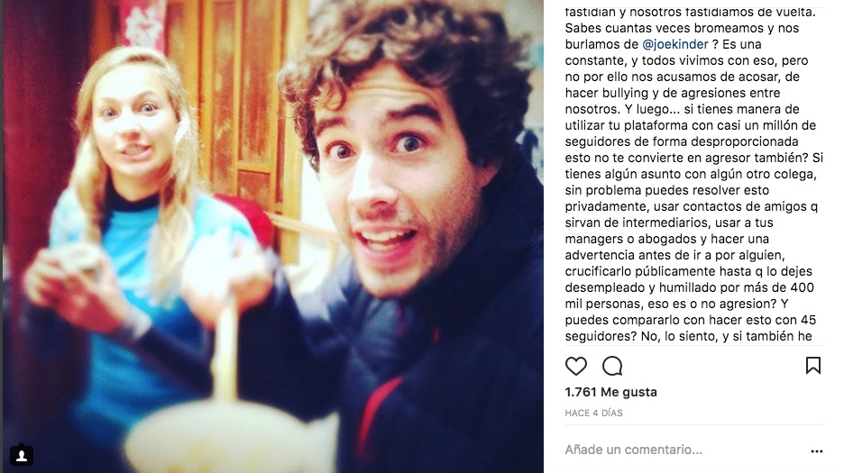 Para otros, sin embargo, la situación ha llegado demasiado lejos, tanto que incluso podría costarle la carrera profesional a Joe Kinder; por ejemplo, Jimena Alarcón, esposa de Chris Sharma, quien publicó su perspectiva en un post de su cuenta de Instagram y que se puede leer a continuación.