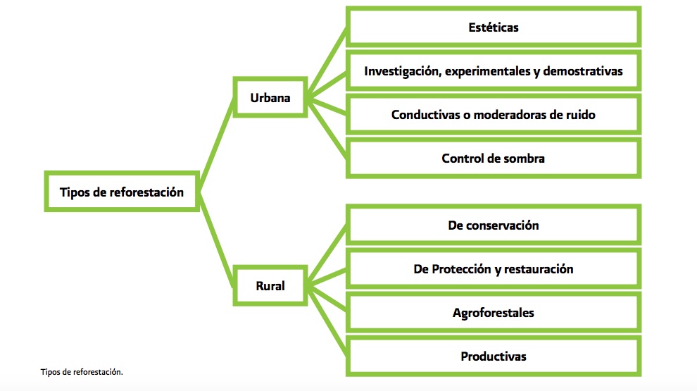 En términos generales, hay dos tipos de reforestación: la urbana y la rural. La primera es la que se realiza en las ciudades para distintos fines. La segunda es la que se realiza en superficies forestales (donde había bosque, selva, entre otros), con la finalidad de recuperar su riqueza de vegetación.