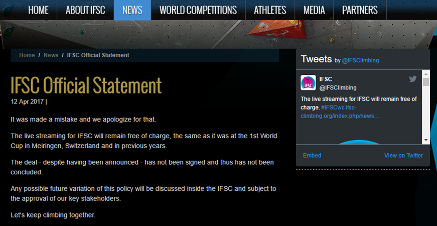 La respuesta de la comunidad escaladora fue unánime y conforme pasaba el tiempo, la noticia se hizo viral. Asociaciones y personalidades influyentes del medio rechazaron el acuerdo y fue cuestión de horas para que surgiera una campaña desde el portal change.org, en el cual se invitaba a la comunidad a firmar la petición ante la IFSC para mantener libres de cuota las transmisiones en vivo.