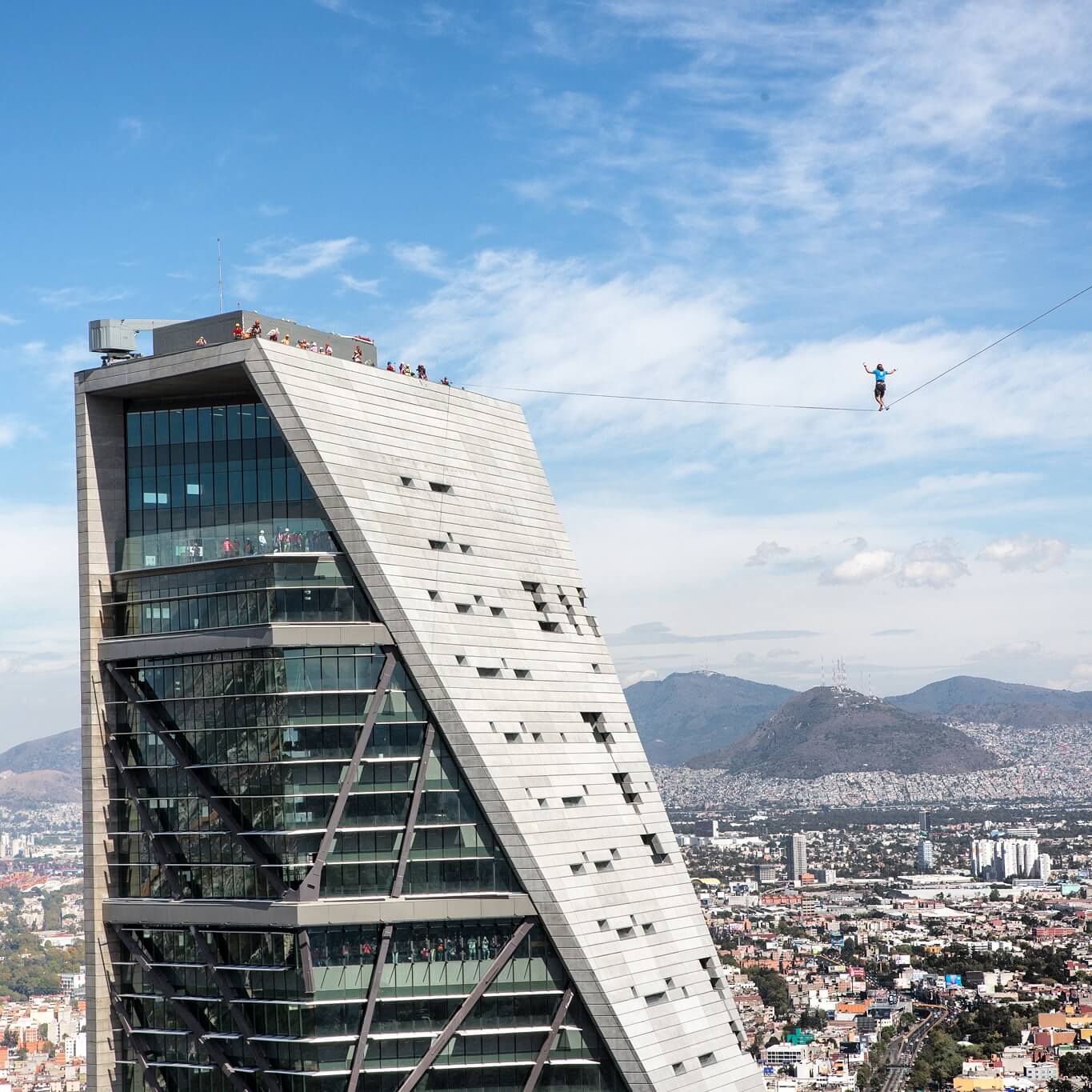 Con este evento sin precedentes en la ciudad de México, el alemán rompió dos récords mundiales, el highline urbano más alto del mundo (246 metros) y el highline urbano más largo del mundo (217 metros).