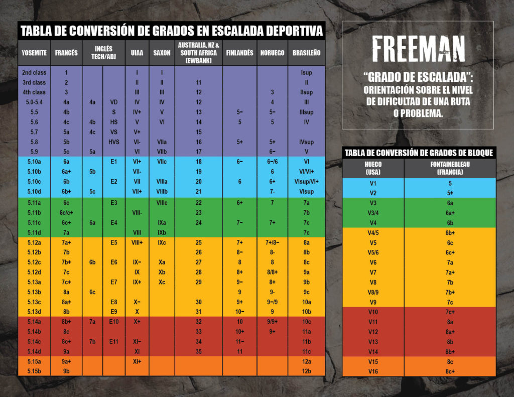 La tabla de conversión de grados de escalada, breve explicación sobre la graduación y reflexiones en torno a su precisión.