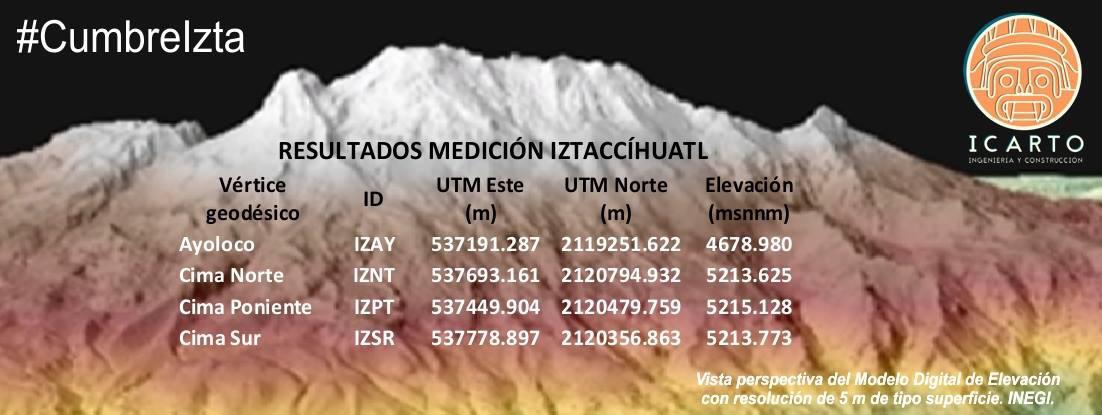 Después de una profunda labor técnica, logística, legislativa por parte del Ing. Victor Gustavo Cervantes (Grupo ICARTO S.A. de C.V.) y el Lic. Carlos Sandoval (sandowalsky.com), el Colegio de Ingenieros Topógrafos A.C. (CITAC) y el apoyo del CEMAC, bajo las legislaciones y autorizaciones del Parque Nacional Izta-Popo, la CONANP, SEMARNAT y el INEGI, así como con el apoyo de un buen número de alpinistas voluntarios, se consiguió el dato más preciso de la altitud de las cimas principales del volcán Iztaccíhuatl.