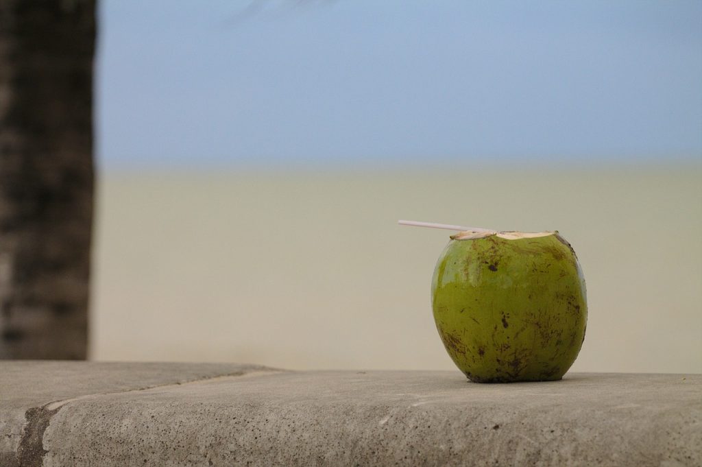 El agua de coco es una buena fuente de potasio y no contiene grasa (la “carne” del coco sí, al agua no).