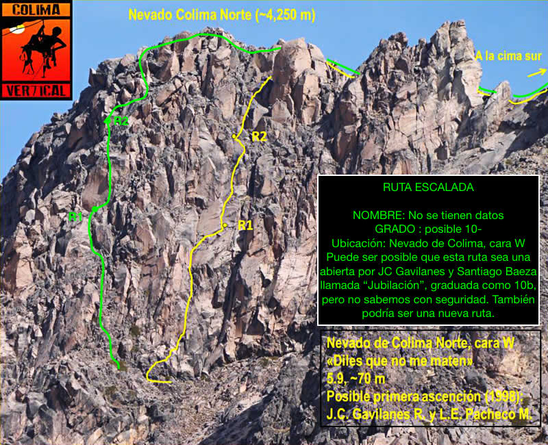 Pero para un escalador, la cima norte es “la cima” que hay que conquistar en el Nevado de Colima. Hay cientos de posibilidades con diferentes grados de dificultad, y escalarla siempre es una gran aventura. De entre todas sus posibilidades de ascenso, hay una ruta en específico, ubicada en la cara Oeste de la montaña, que fue abierta en 1998 y que se ha convertido en un clásico por su belleza. La ruta se llama “Diles que no me maten” y es un 5.9 trad de 3 largos que Hugo y yo habíamos decidido escalar. Elegimos esta ruta, porque, además de ser una línea muy bonita, es una ruta de la que hay más información disponible para planear lo mejor posible el ascenso y disminuir en la mayor medida de lo posible los riesgos.