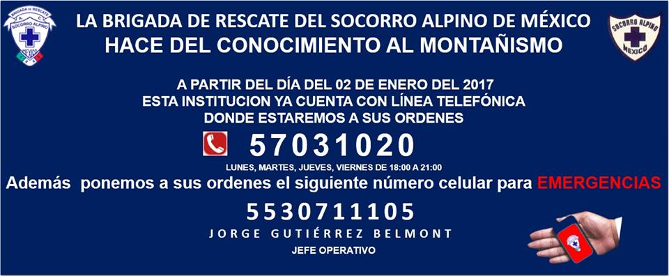 A partir del 2 de enero de éste año, la brigada de rescate del Socorro Alpino de México AC contará con un teléfono de atención, mismo que acaba de ser puesto a las órdenes de la comunidad montañista nacional. El teléfono es el (55)-5703.1020 y estará en servicio los días lunes, martes, jueves y viernes de 18:00 a 21:00 horas.