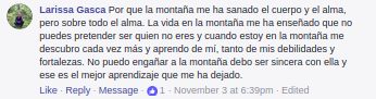 En nuestro post encontramos muchas y diversas explicaciones: “porque en la montaña la felicidad es auténtica”; “porque te encuentras a ti mismo”; “porque te hace sentir vivo”; “porque te hace darte cuenta que eres uno más, es decir, te enseña la humildad”; “porque muestra tus límites y te motiva a superarlos”; “porque te enseña a controlar y valorar el miedo”; “porque es el territorio de la libertad”; “porque nos despierta nuestro lado libre y salvaje”; “porque allí se rompen los paradigmas”; “nos ayuda a trazar nuestros propios horizontes”; “porque en la montaña aprendemos a encontrar la paz interior”.