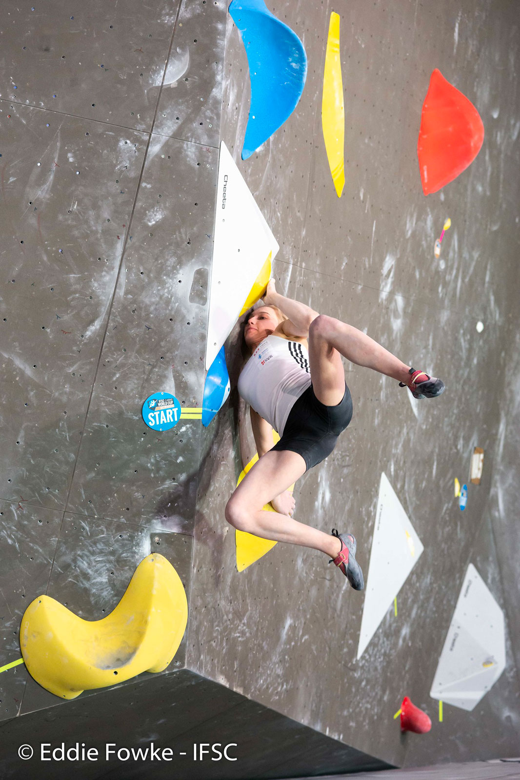 En la rama femenil, la batalla por el primer lugar fue disputada entre la japonesa Akiyo Noguchi y la eslovena Janja Garnbret. Shauna Coxsey se quedó justo detrás (campeona de temporada de la Copa Mundial de Bloque en 2016 y 2017, se vio afectado por las lesiones el año pasado, pero regresó con una actuación en Meiringen que superó las expectativas).