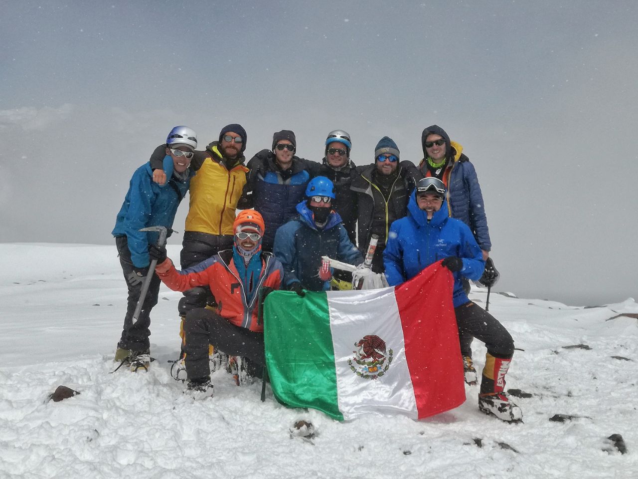 Con un clima estable pero que comenzaba a cerrarse llegamos a la cumbre, donde encontramos a dos personas más. Me sentía pleno, pero alerta; las nubes amenazaban con empezar a precipitar en cualquier momento. Abrazos, lágrimas, agradecimientos y algunas fotos. Después tomé la decisión de comenzar el descenso. Empezó a nevar un poco. Les pedí concentración, pues la mayoría de los accidentes ocurren en la bajada.