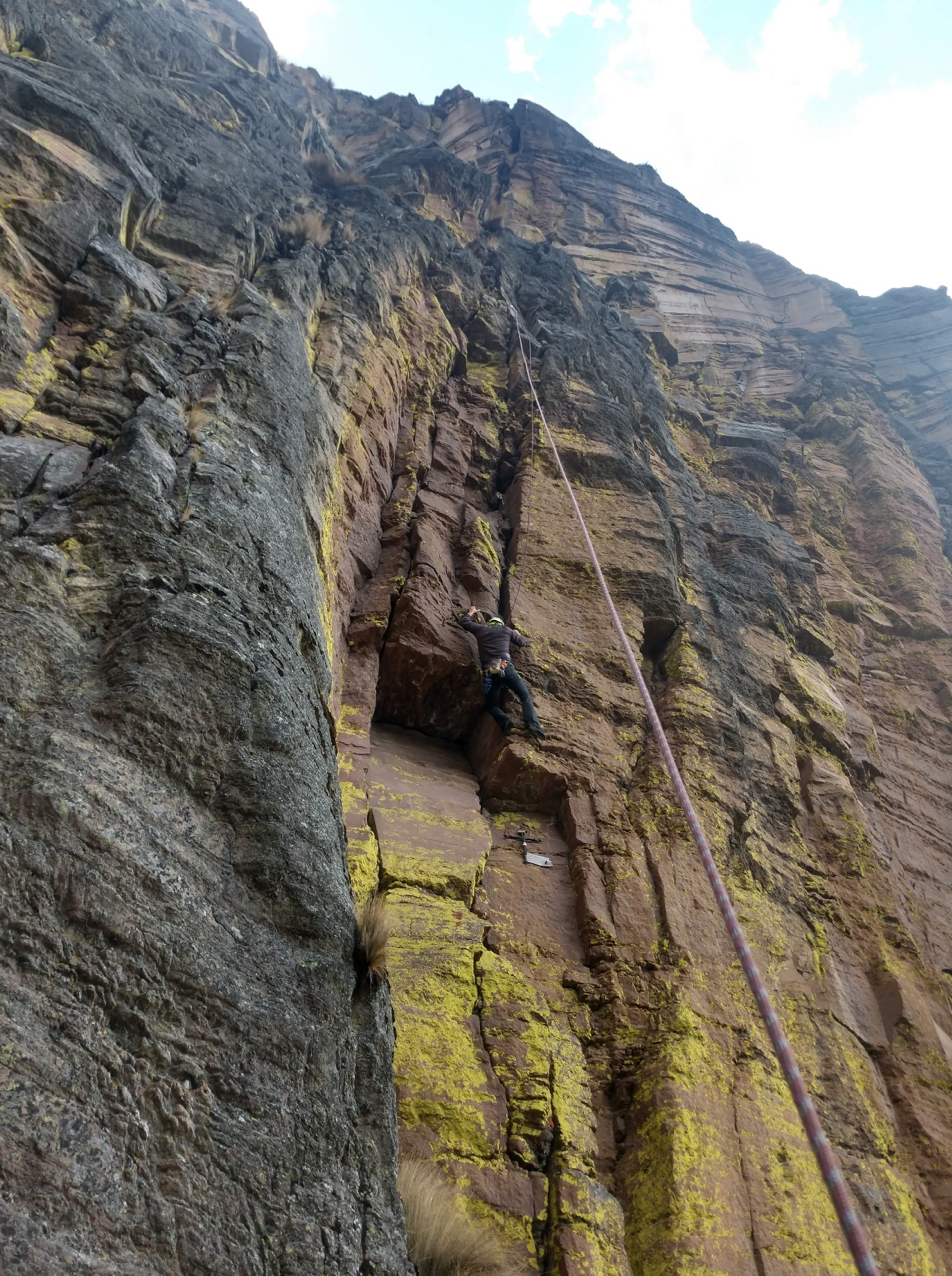 Lo que nos encontramos fue un tipo de roca un poco rara en su estructura, ya que se ve quebrada pero realmente tiene una consistencia sólida, además cuenta con una buena adherencia. Sin embargo, de esto nos dimos cuenta hasta las posteriores escaladas que hicimos. Ese primer día, y después de pasar tres horas colgado, pude llegar a un punto donde logré emplazar una reunión con un par de fisureros y un micro friend, (aquel que haya estado en una reunión con estos dispositivos sabrá qué tipo de tranquilidad brindan). “¡Perfecto! aquí pondremos la primera reunión, Kevin. Mándame el taladro. Oh, pero ¿cómo? ¡No! Olvidé una línea alimentadora, bueno te mandaré mi cuerda, listo, ya lo puedes subir, puf esta cosa como pesa, OK, debo acomodarme lo mejor que pueda para taladrar, ojalá no se salga la reunión, listo, ¡bajo!”. Me dolía todo, la espalda, las piernas, mi mente no quiere más estrés, otro golpe de realidad, abrir una ruta aquí no sería tan sencillo como lo pensé.