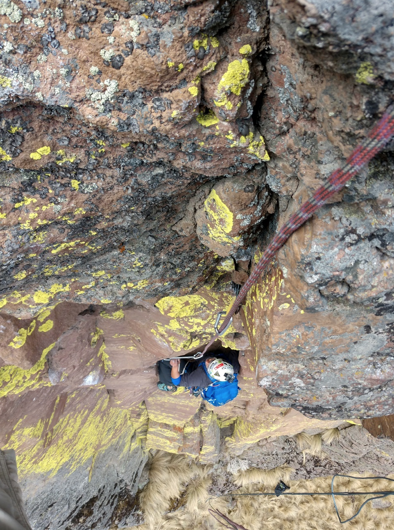 Desde la tercera reunión esperé con ilusión que Kevin encadenara la sección. Me comentó que se sentía confiado para afrontarla, pero también cayó por un error en pies. Escalar aquí no es fácil y los esfuerzos generan bastante cansancio. Continuamos a la cuarta reunión tranquilamente. Desde este punto la pared no parece ceder brindándonos una escalada más fácil y accesible a la cima, nuevamente tendríamos que abrirnos paso a lo desconocido.