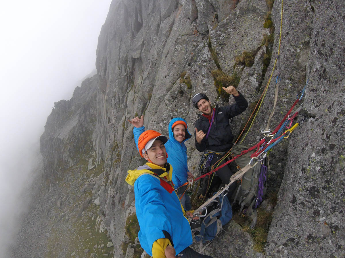 A los pocos metros supe que había sido una pésima idea. Me encontraba parado sobre una torre de Jenga gigante. Bloques sobrepuestos uno sobre otro me hacían sentir que el riesgo no venía de una caída sino de tirar las rocas con mi peso. Entré en pánico e hice travesías en roca que escurría y generé terribles tracciones de cuerda hasta que pude armar una reunión. Carlos subió limpiando el equipo y nos encontramos en una reunión a 15 metros del pico, con cero motivación y decidimos abandonar.