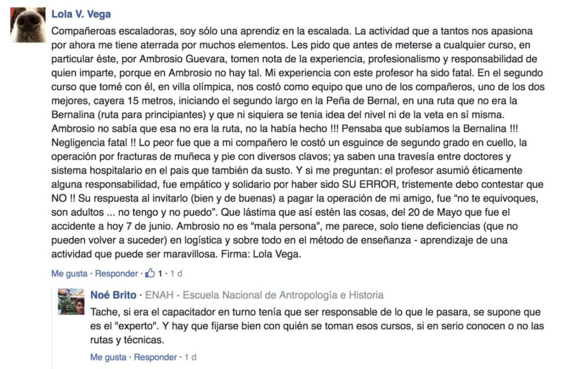 En curso impartido por TesseracT Asciende el pasado 20 de mayo, un joven sufrió un accidente escalando una ruta en Peña de Bernal. De los hechos derivó una fuerte polémica en redes sociales. A continuación relatamos el caso, con el fin de que el lector pueda extraer sus propias conclusiones.