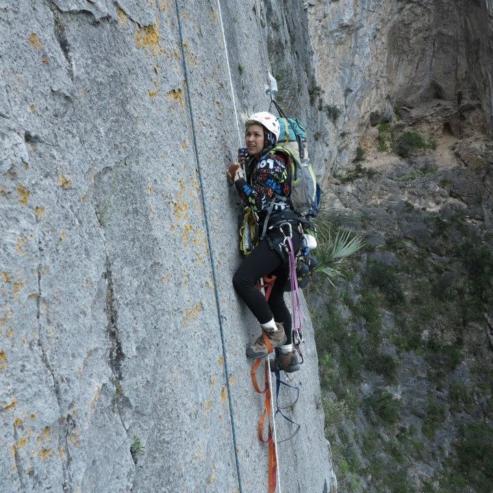 Karla Moya, a sus 37 años de edad, es sin duda una de las mexicanas con más experiencia como escaladora de gran pared. Lleva prácticamente media vida escalando, 16 años para ser exactos y actualmente se desempeña como Guía de Escalada en Roca, principalmente en la zona de Potrero Chico.
