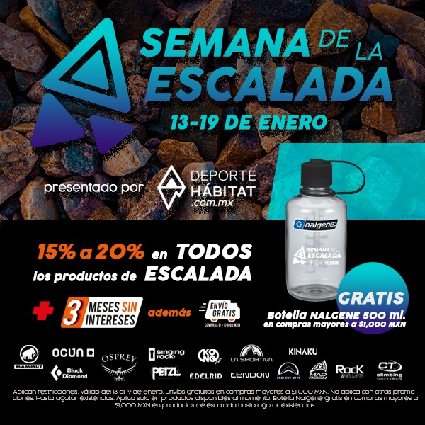*Aplican restricciones. Válido del 13 al 19 de enero. Envíos gratuitos en compras mayores a $1,000 MXN. No aplica con otras promociones. Hasta agotar existencias. Aplica solo en productos disponibles al momento. Botella Nalgene gratis en compras mayores a $1,000 MXN en productos de escalada hasta agotar existencias.