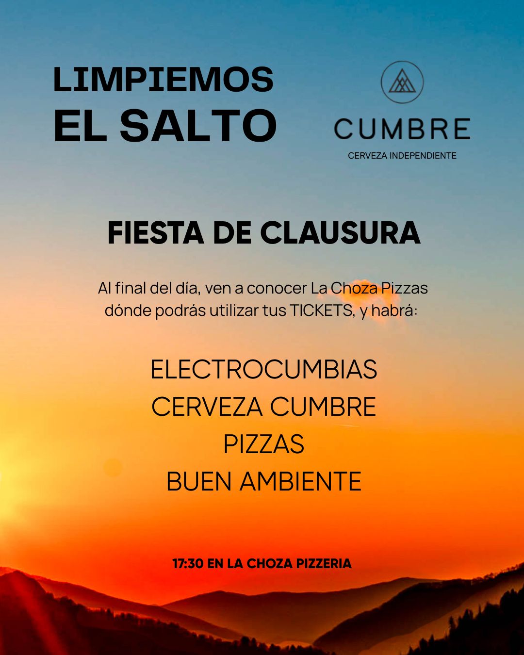 El cierre del evento será a las 7:30 PM en La Choza Pizzas, con una fiesta donde habrá música en vivo, DJ, comida y un ambiente festivo. Los tickets obtenidos durante la jornada podrán canjearse por cervezas artesanales, pizza, playeras y otros premios (2 tickets = 1 cerveza, 1 ticket = 1 rebanada de pizza).