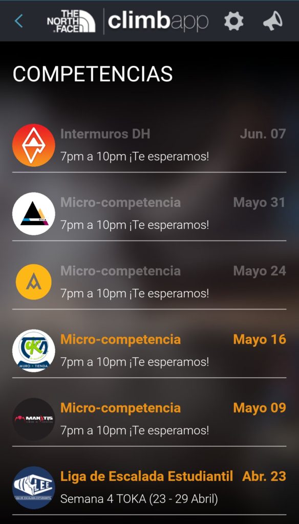 ClimbApp cuenta con una sección en el menú llamada «Competencias» a la que hay que ingresar. Una vez dentro de la competencia hay tres pestañas más: ‘Muros’, ‘Participantes’ y ‘Agregar’.